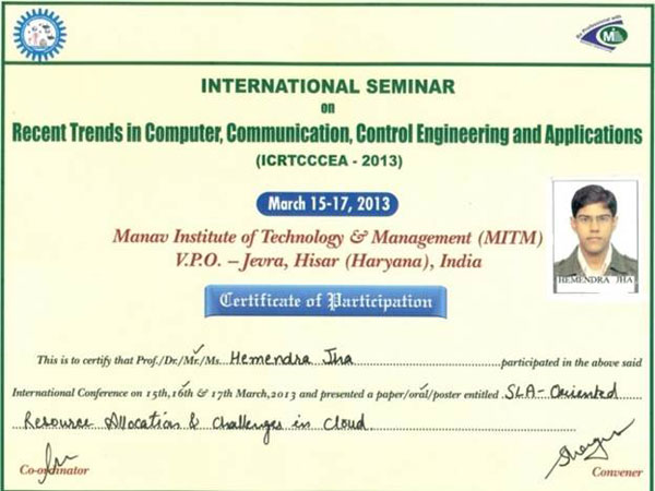 The main objective of the International conference was to take stock of current scenario of Computer and Electronics Engineering Technologies available worldwide. It was to discuss about the regional preference for pragmatic Information Technologies and to create a network for International co-operation in Communication and Allied Technologies. The delegates from six different countries Asia, Africa, Europe, America, Canada and India participated in this International Conference. |