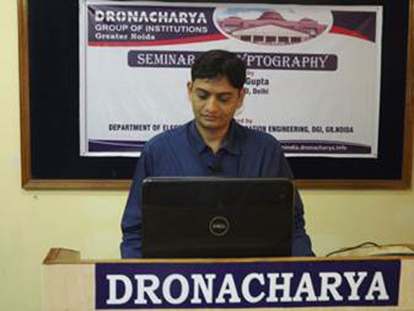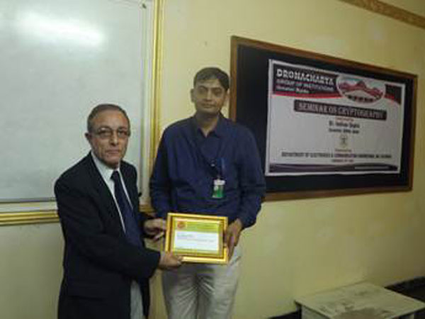 Department of Electronics & Communication Engineering, Dronacharya Group of Institutions, Greater Noida organized a Seminar on Cryptography on 19th February, 2015. The resource person for the lecture was Dr. Indivar Gupta, Scientist E, Defence Research and Development Organization (DRDO).